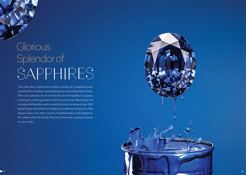 The color blue inspires the timeless beauty of a sapphire jewel, renowned for its deep, mesmerizing hue and unparalleled clarity. The color spreads an air of serenity and tranquility to spaces,