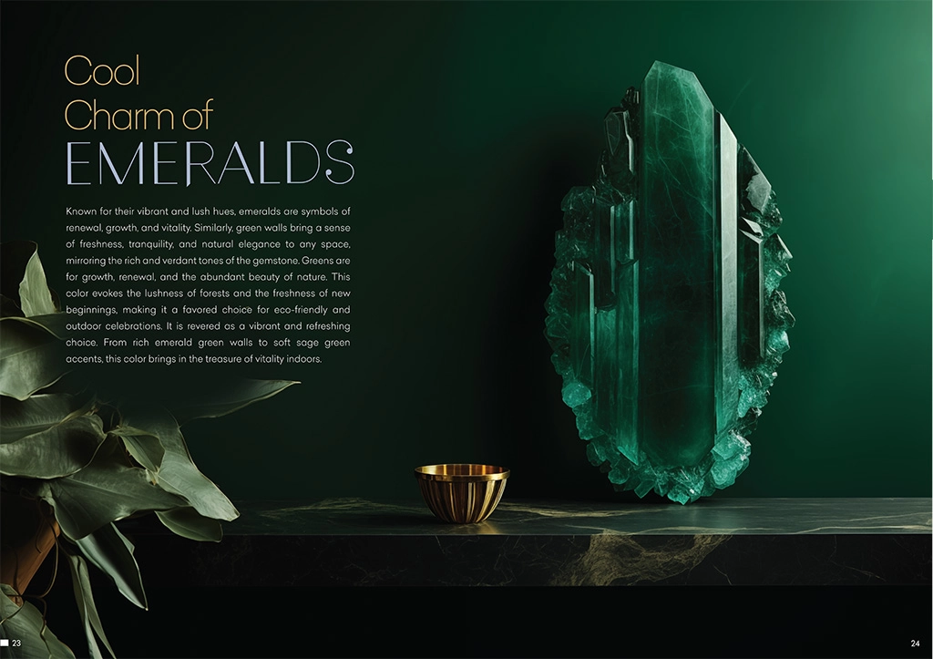 Known for their vibrant and lush hues, emeralds are symbols of renewal, growth, and vitality. Similarly, green walls bring a sense of freshness, tranquility, and natural elegance to any space, mirroring the rich and verdant tones