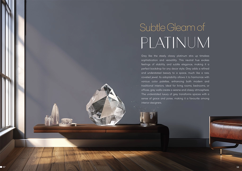 Grey like the steely, classy platinum stirs up timeless sophistication and versatility. This neutral hue evokes feelings of stability, and subtle elegance, making it a perfect backdrop for any decor style. Grey adds a refined