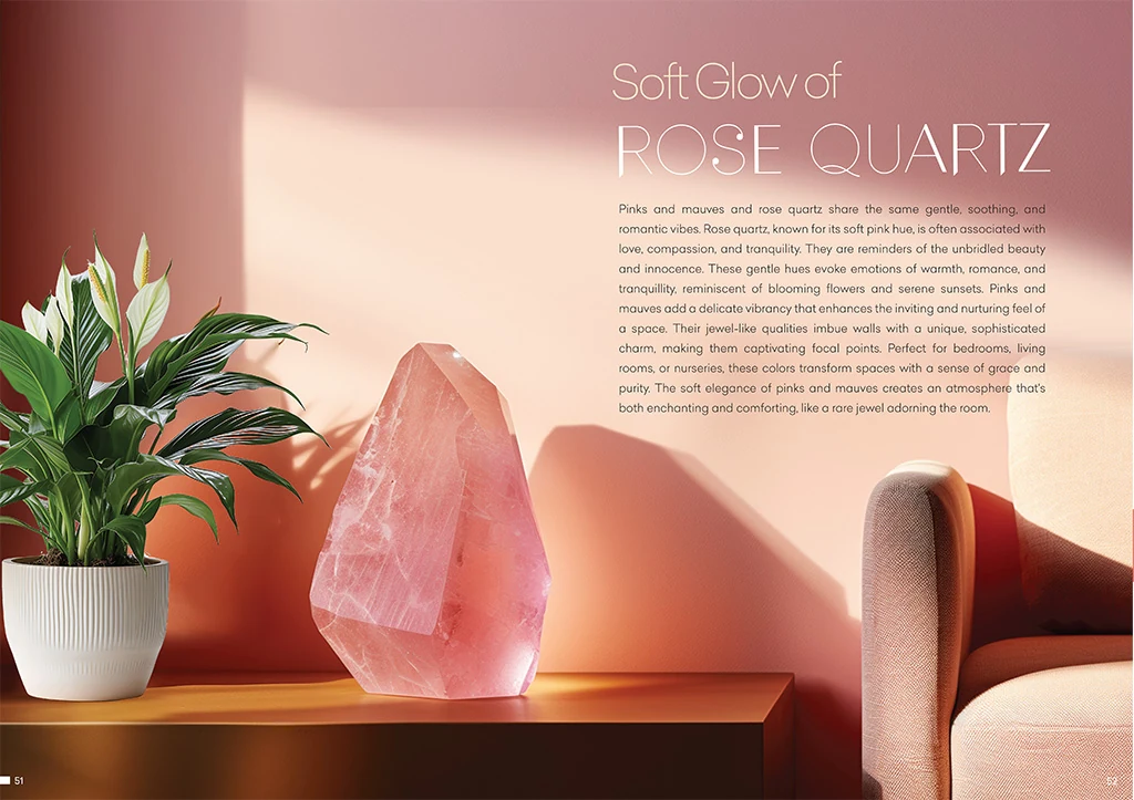 Pinks and mauves and rose quartz share the same gentle, soothing, and romantic vibes. Rose quartz, known for its soft pink hue, is often associated with love, compassion, and tranquility. They are reminders of the unbridled beauty