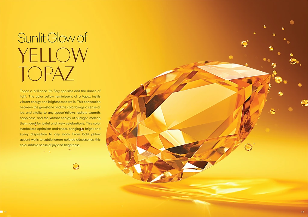 Topaz is brilliance. It’s fiery sparkles and the dance of light. The color yellow reminiscent of a topaz instils vibrant energy and brightness to walls. This connection between the gemstone and the color brings a sense of joy