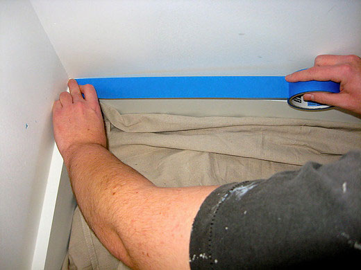 Mask off the tops of the walls with 2-inch blue painter’s tape. One-inch tape would allow the roller to strike the wall.