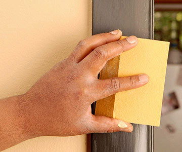 Fill gaps in trim and baseboard with paintable caulk, then sand lightly with 220-grit sandpaper. Use a sanding block for flat surfaces, a brass-wire brush for fluted surfaces.