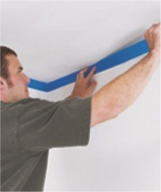 Mask off the tops of the walls with 2-inch blue painter’s tape. One-inch tape would allow the roller to strike the wall.